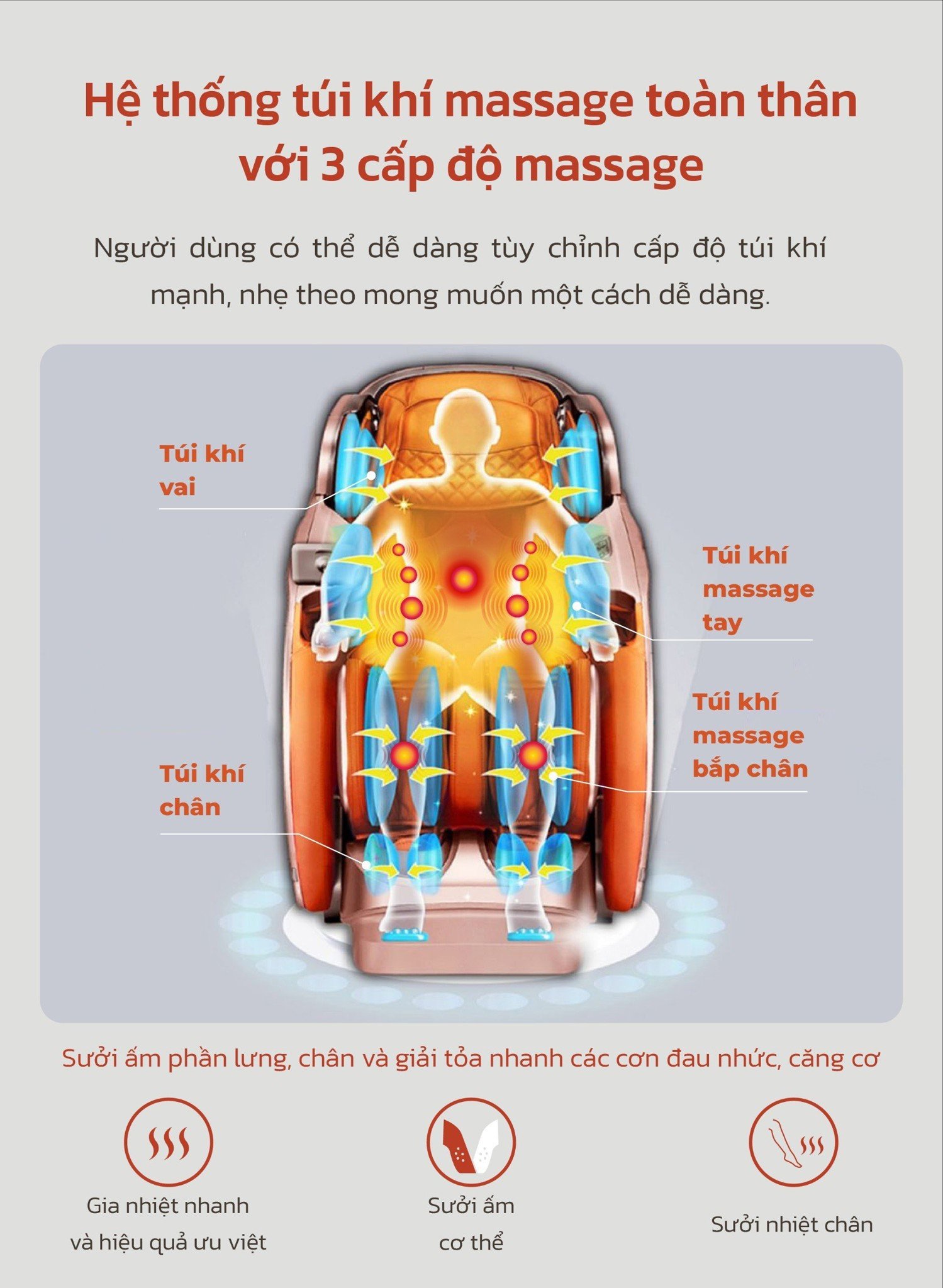 | Túi khí | Hệ thống 8 Cụm – 110 Túi khí phân bổ khắp cơ thể, nâng niu xương khớp |