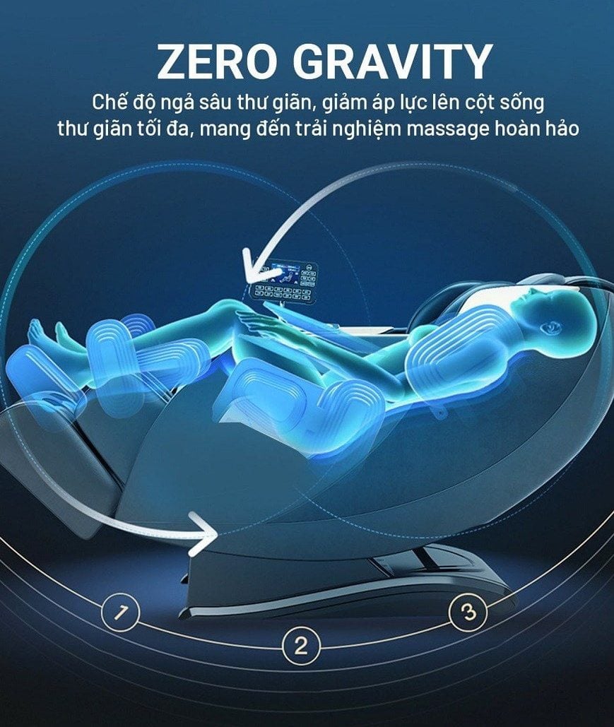 Ở chế độ này toàn thân sẽ được nâng đỡ với góc nghiêng khoảng 170 độ, đây được gọi là tư thế không trọng lực hay còn gọi là “tư thế tự nhiên” lý tưởng để thư giãn toàn thân, giúp giảm áp lực lên cột sống, mang lại cảm giác tuyệt vời và hiệu quả hơn.