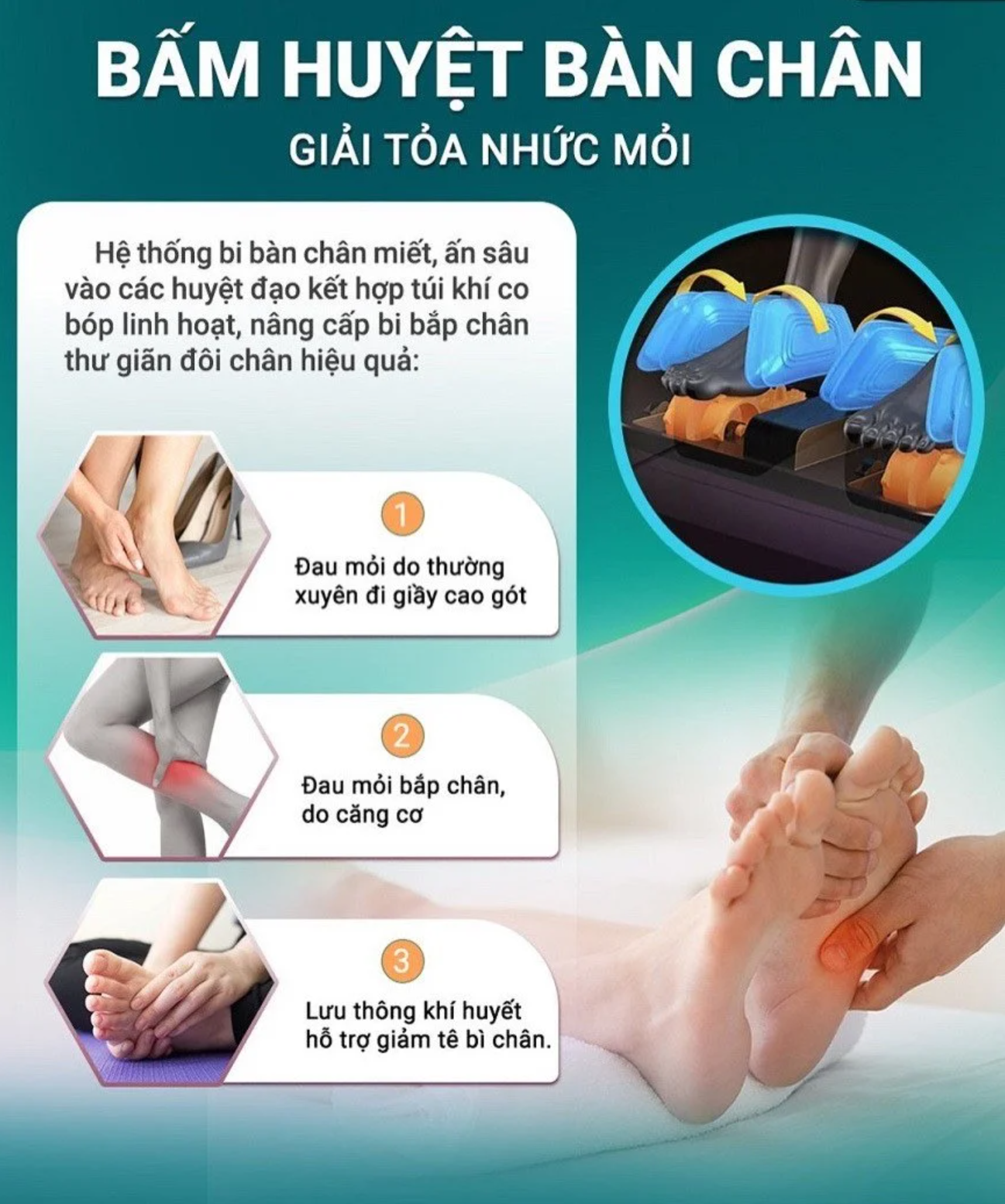 Massage đôi bàn chân : Đôi chân con người được ví như trái tim thứ hai với hàng trăm huyệt đạo việc trang bị con lăn massage cao cấp sẽ giúp bạn trải nghiệm cảm giác massage chân chuyên nghiệp, hỗ trợ máu sẽ được lưu thông, hỗ trợ giảm đau nhức và tạo giấc ngủ sâu.