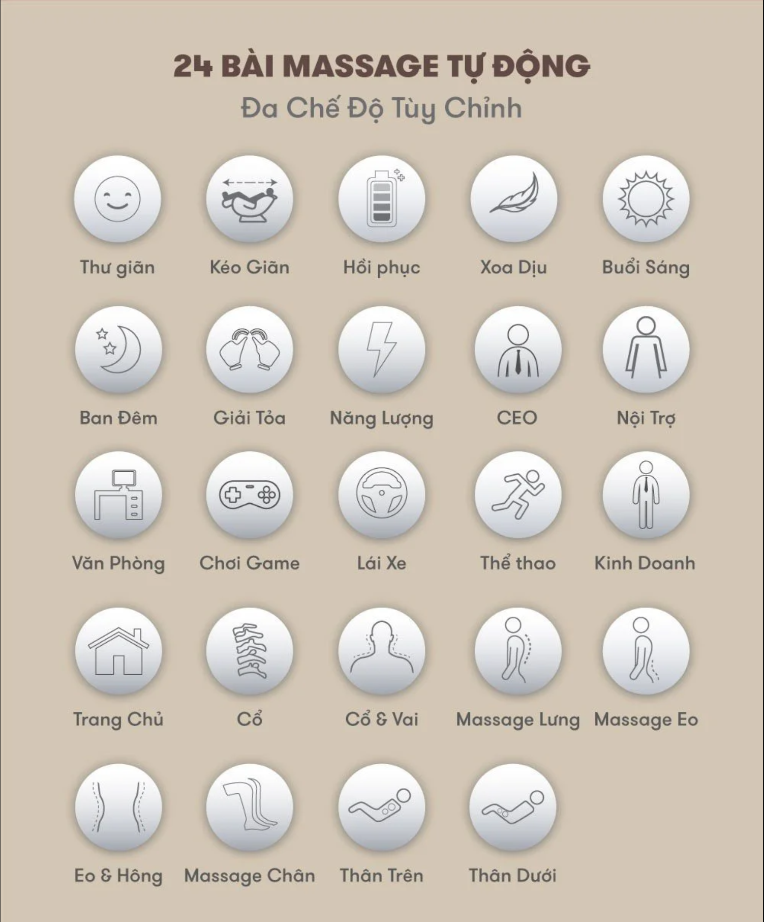 | Chương trình massage | 24 chương trình massage linh hoạt |